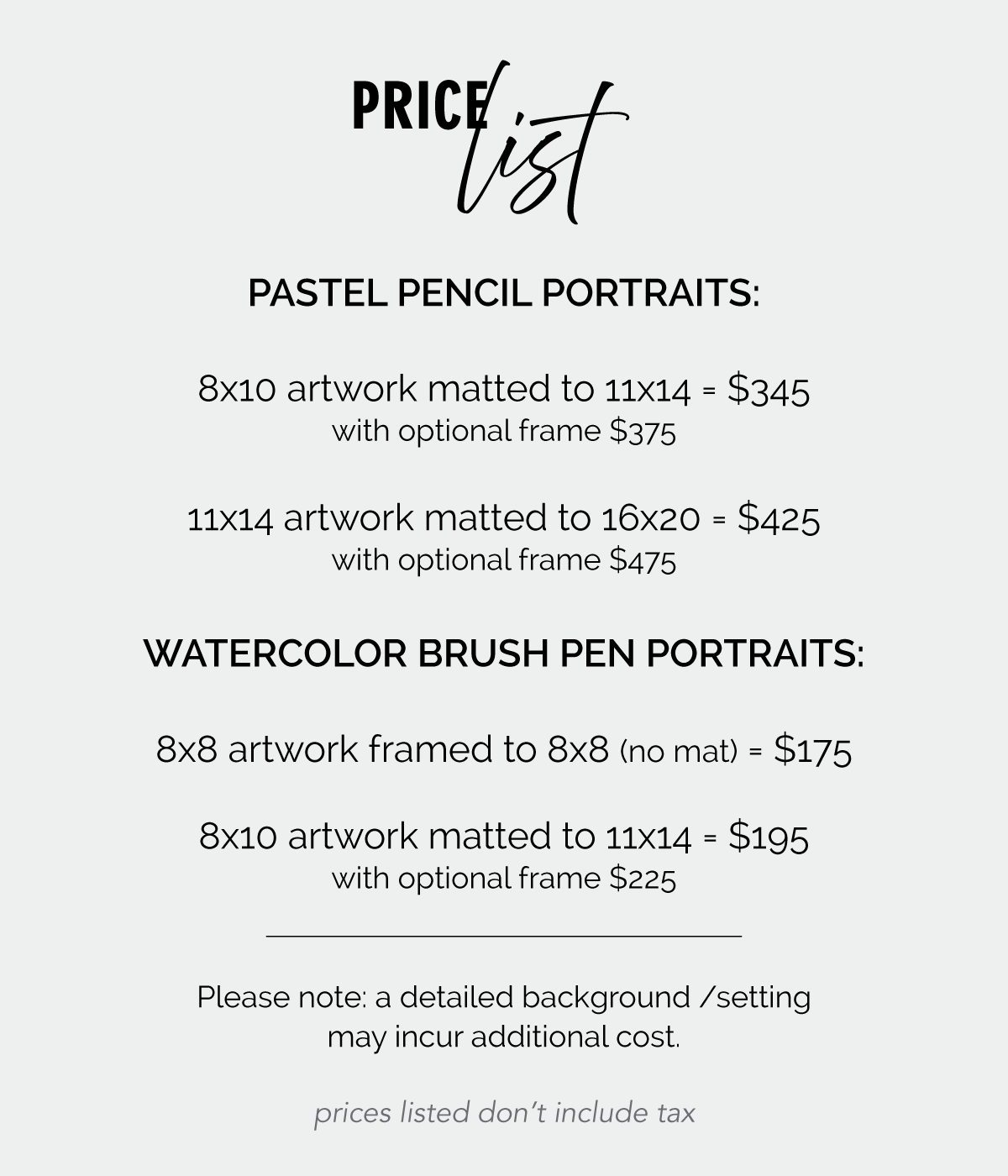 Multiple pets in a single portrait: Prices listed are for one pet in a portrait. If you are interested in multiple pets in a single portrait, contact me to request a quote.